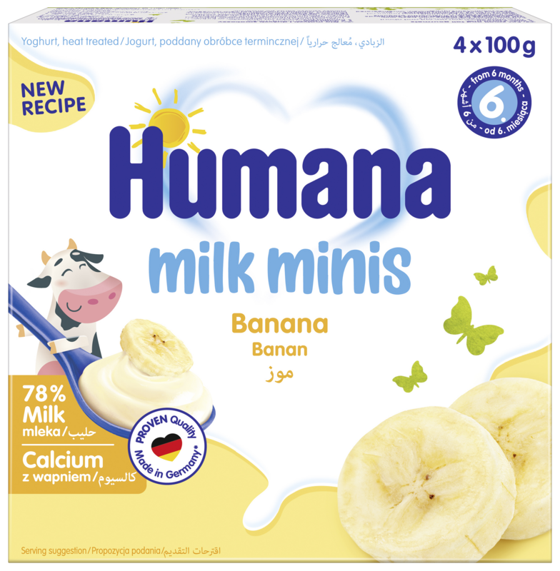 Το Humana milk minis Banana μας είναι φτιαγμένο από φρέσκο και φρουτώδες γιαούρτι* αναμεμειγμένο με εκλεκτό πουρέ μπανάνας. Είναι ένα ιδανικό σνακ για το δρόμο χωρίς να χρειάζεται ψυγείο. Είναι νόστιμο για όλη την οικογένεια!